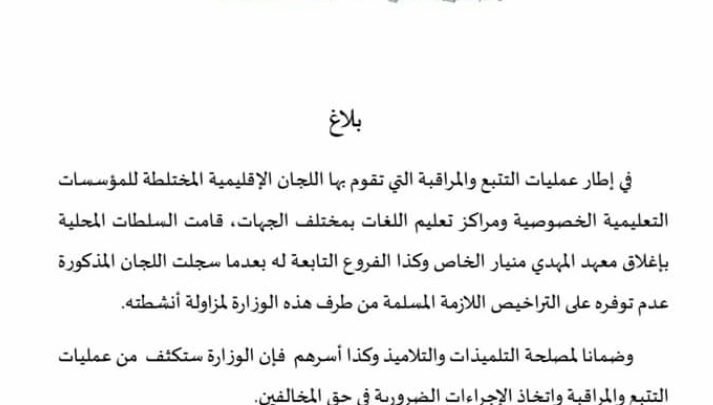اصدرة وزارة التربية و التكوين المهني اليوم الخميس بلاغا جاء فيه ، انه في إطار عمليات التتبع والمراقبة التي تقوم بها اللجان الإقليمية المختلطة للمؤسسات التعليمية الخصوصية و مركز تعليم اللغات بمختلف الجهات ، قامت السلطات المحلية بإغلاق معهد (م.م.) المعروف بالاستاذ المعجزة و كذا الفروع التابعة له بعدما سجلت اللجان المذكورة عدم توفره على التراخيص اللازمة من طرف الوزارة لمزاولة انشطته ، و ضمانا لمصلحة التلميذات و التلاميذ و كذا أسرهم فإن الوزارة ستكثف من عمليات التتبع و المراقبة و اتخاذ الإجراءات الضرورية في حق المخالفين.
