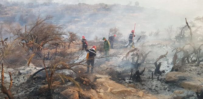 وهو الحريق الذي استنفر كل الأجهزة التي انتقلت على وجه السرعة إلى عين المكان، حيث باشرت عملية إخماد النيران والتي لم تكن بالسهلة بالنظر للصعوبات الجنة المرتبطة بتضاريس المنطقة الوعرة وايضا لرياح الشركي التي ساعدت في انتشار وانتقاله السنة النيران الى اجزاء عدة من الغطاء النباتي للمنطقة وقد باشرت الفرق المختصة عملية تطويق النيران والحد من انتشارها، مستعملة وسائل ميدانية وتقنية لمواجهة صعوبة التضاريس والرياح القوية التي ساهمت في توسع رقعة الحريق.