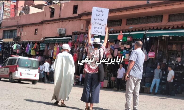 اوقفت عناصر الشرطة التابعة للدايرة الأمنية بجامع الفنا بمراكش ظهر اليوم الثلاثاء 23 شتمبر الجاري سيدة أجنبية من جنسية رومانية ، كانت تحمل لافتة فوق رأسها تدعو من خلالها الى وقف الحرب على غزة و مقاطعة إسرائيل.