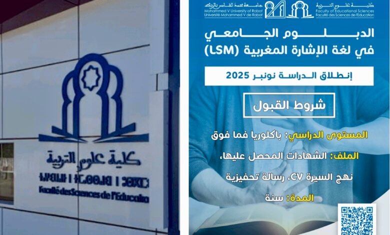 في إطار تعزيز مسارات التكوين الجامعي الدامج والمستجيب لحاجيات فئات المجتمع، تنظم كلية علوم التربية بجامعة محمد الخامس بالرباط، مساء الجمعة 14 نوفمبر الجاري على الساعة الثالثة و النصف عصرا بقاعة المحاضرات برحاب كلية علوم التربية بجامعة محمد الخامس بالرباط، حفلاً بمناسبة تخرج أول فوج في تكوين لغة الإشارة المغربية للسنة الجامعية 2024 – 2025.