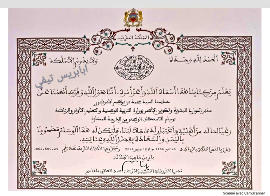 وحسب بلاغ للوزارة، فإن هاد العطف الملكي شمل بوسام الاستحقاق الوطني 18 موظفة وموظفا، تتوزع بين وسام الاستحقاق الوطني من الدرجة الممتازة، ووسام الاستحقاق الوطني من الدرجة الأولى، ووسام الاستحقاق الوطني من الدرجة الثانية. ومن بين الأطر المركزية التي وشحت بالأوسمة الملكية يوجد الحسين أقوضاض الكاتب العام بالنيابة العامة والمفتش العام لقطاع التربية الوطنية، و محمد أضرضور مدير مديرية الموارد البشرية.