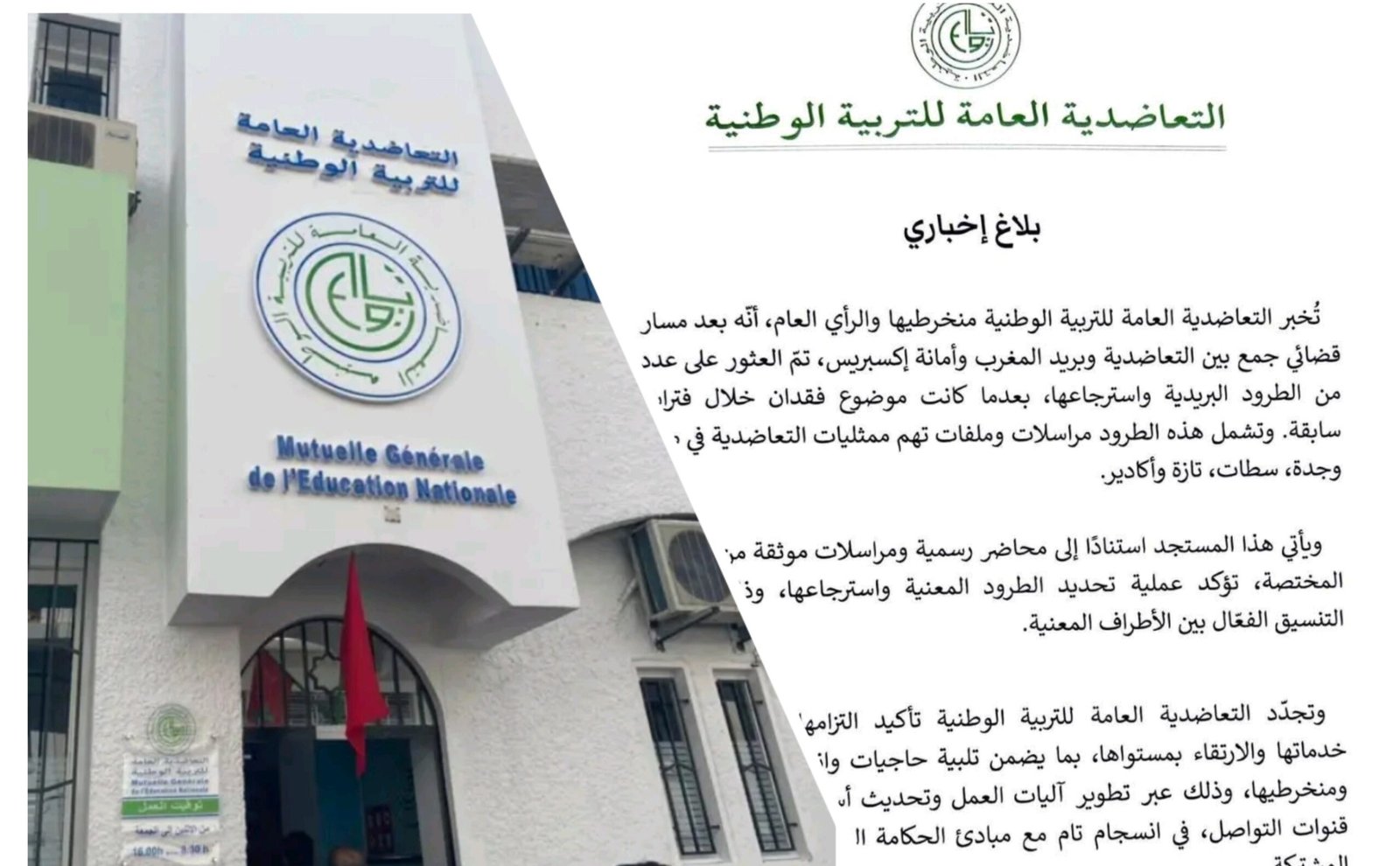 توضيح التعاضدية العامة للتربية الوطنية عن الطرود البريدية التي كانت مفقودة